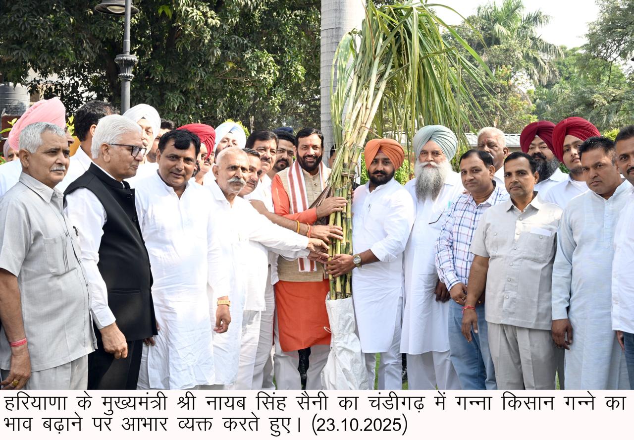 नायब सिंह सैनी ने कहा कि राज्य सरकार ने अगेती किस्म के गन्ने का रेट 400 रुपये प्रति क्विंटल से बढ़ाकर 415 रुपये प्रति क्विंटल तथा पछेती किस्म का रेट 393 रुपये प्रति क्विंटल से बढ़ाकर 408 रुपये प्रति क्विंटल करके किसानों की आय बढ़ाने की दिशा में कदम उठाया है। उन्होंने कहा कि गन्ने के समर्थन मूल्य में की गई बढ़ोतरी किसानों की मेहनत और समर्पण को सम्मान देने के साथ-साथ उनकी आर्थिक स्थिति को और मजबूत करेगी।