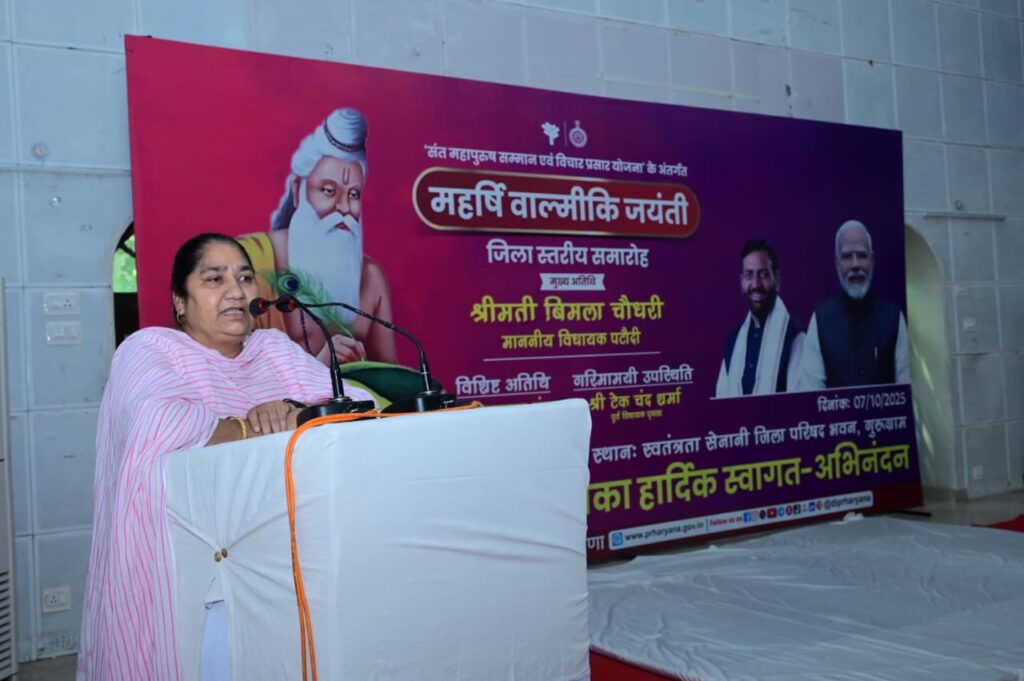 महर्षि वाल्मीकि भारत के आदि कवि और महान ऋषि थे, जिन्होंने न केवल संस्कृत भाषा को समृद्ध किया बल्कि शिक्षा, सत्य और परिश्रम का अमर संदेश भी दिया। हजारों वर्ष पूर्व रचित उनकी रामायण आज भी मानवता को धर्म, करुणा और आदर्श जीवन की प्रेरणा देती है। उन्होंने समाज को यह सिखाया कि सत्य के मार्ग पर चलना ही सबसे बड़ी साधना है।यह बात पटौदी से विधायक बिमला चौधरी ने कही। वे मंगलवार को सिविल लाइंस स्थित स्वतंत्रता सेनानी जिला परिषद सभागार में हरियाणा सरकार की संत महापुरुष सम्मान एवं विचार प्रसार योजना के दृष्टिगत जिला प्रशासन, सूचना, जनसंपर्क एवं भाषा विभाग हरियाणा द्वारा आयोजित जिला स्तरीय महर्षि वाल्मीकि जयंती समारोह को मुख्य अतिथि के तौर पर संबोधित कर रही थी। समारोह में सोहना के विधायक तेजपाल तंवर विशिष्ट अतिथि के रूप में उपस्थित रहे। वहीं भाजपा के गुरुग्राम महानगर के जिला अध्यक्ष अजीत यादव, निगम पार्षद धर्मबीर भांगरोला की गरिमामयी उपस्थिति रही।