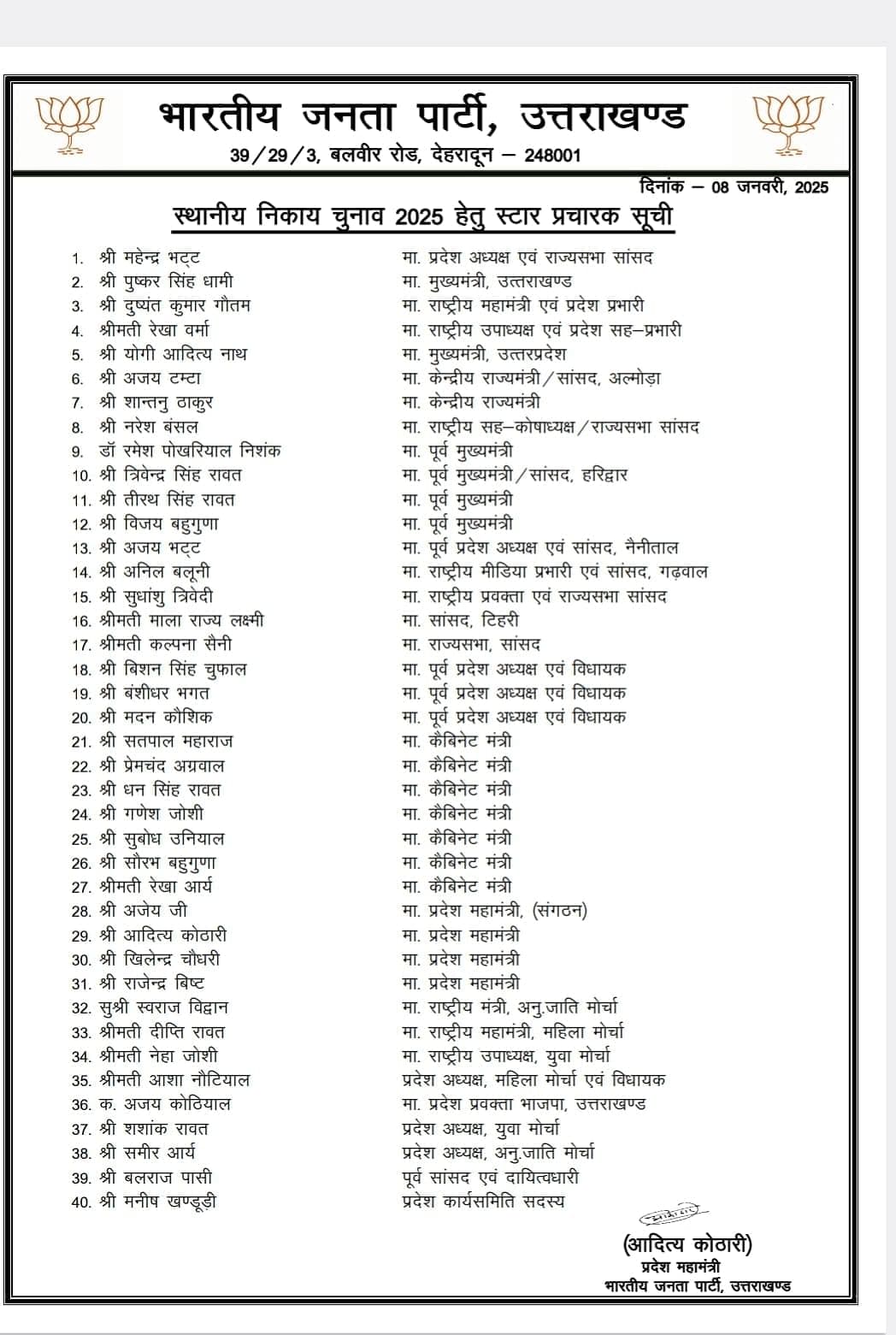 उत्तराखंड में नगर निकाय चुनाव के लिए राजनीतिक दलों की तैयारियां जोरों पर हैं। कांग्रेस के बाद अब भाजपा ने भी अपनी स्टार प्रचारकों की सूची जारी कर दी है।